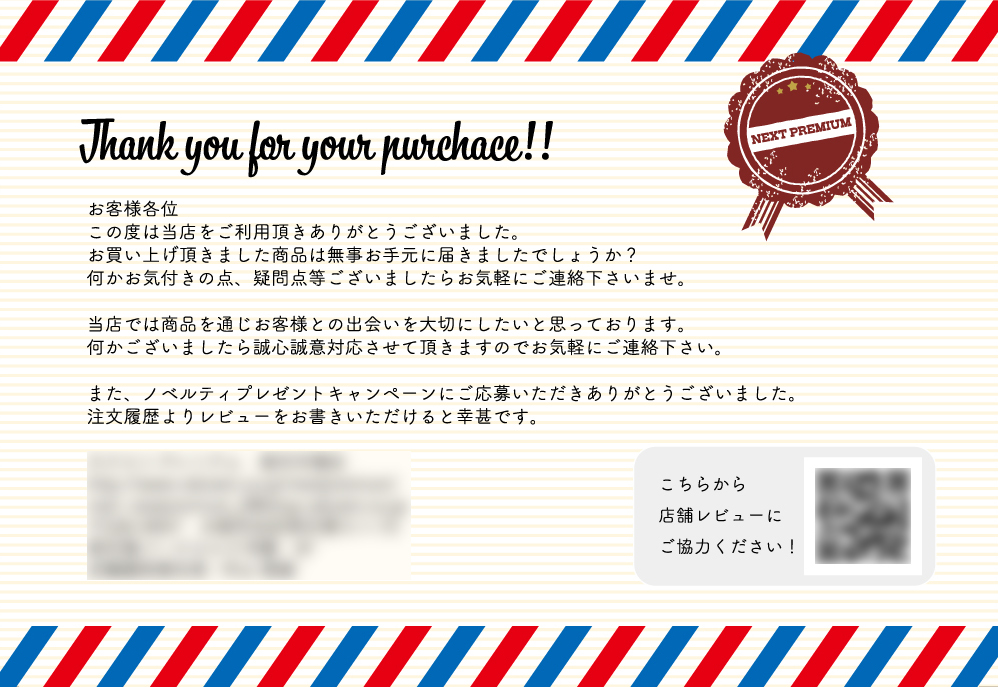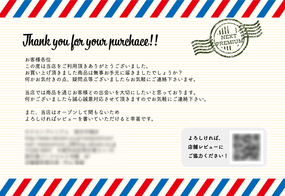 | 制作について | 楽天市場店舗向けにエアーメール風メッセージカードを制作。レビューが条件のノベルティプレゼント対象顧客と、それ以外の顧客用で文面を変えたメッセージカードを作成し、梱包対象者の封入ミスを防ぐために右上のスタンプの色を変えてひと目でわかるようにしています。 右下のQRコードは外部サービスを使用し、アクセス解析とリンク先URL変更を可能にしてメンテナンス性を向上させています。 また、印刷会社の指示に従い、フォントのアウトライン化や塗り足し、CMYKカラーモード、配置画像の埋め込みなどをした.aiファイルを入稿しています。 |