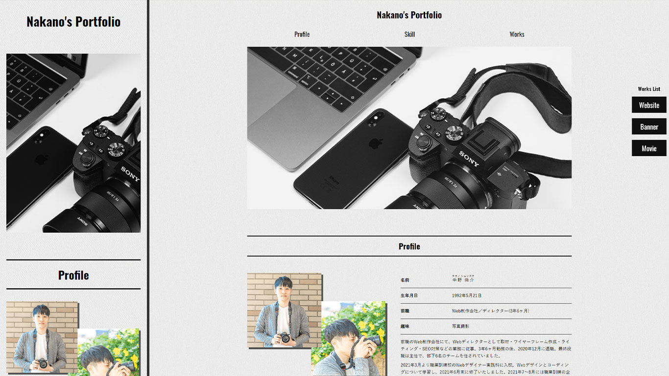 2021年3月より職業訓練校のWebデザイナー実践科に入校。Webデザインとコーディングについて学習し、企業実習を経たのち2021年6月末に修了いたしました。職業訓練の企業実習先ではコーポレートサイトの改善や、楽天市場新規出店に伴うサイト内のバナー作成やコーディングなどのECサイトにおけるデザイン業務に携わりました。